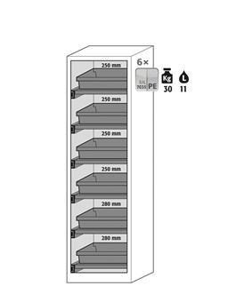 Szafy na chemikalia stosowane są do nieograniczonego przechowywania niebezpiecznych, niepalnych substancji żrących, które zostały zaprojektowane w oparciu o normy TRGS 510, DGUV-I 213-850 oraz zgodnie z rozporządzeniami dotyczącymi substancji niebezpiecznych.